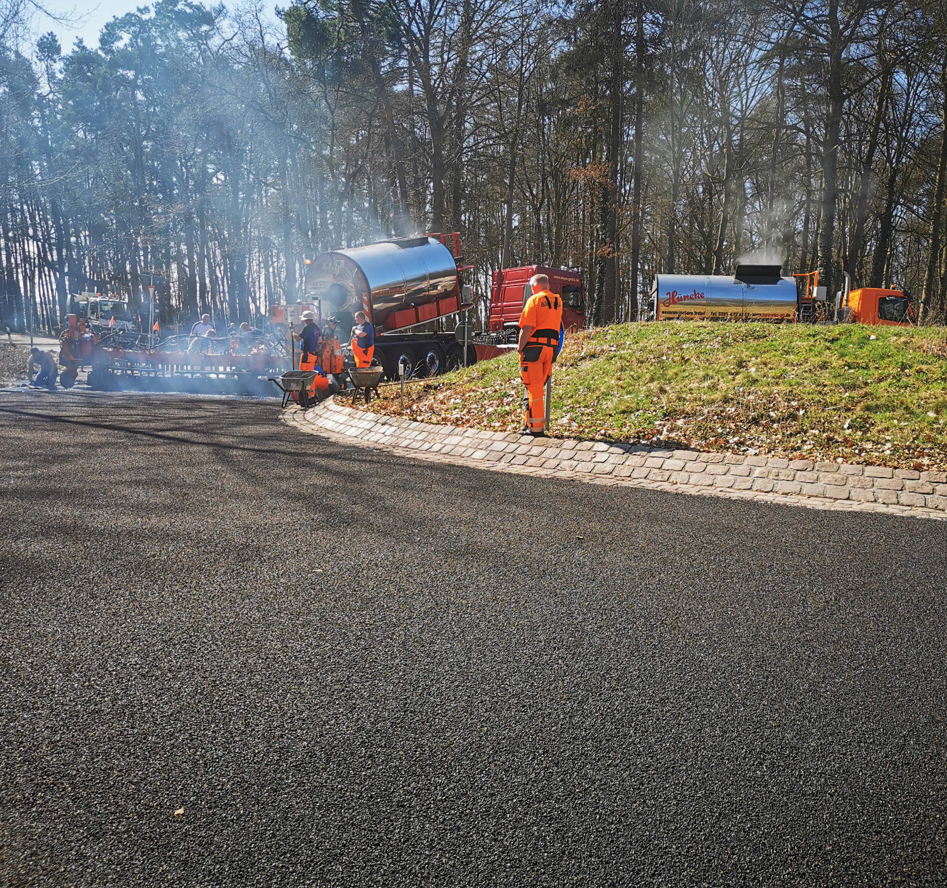 Insgesamt knapp 1000 m² Gussasphalt im Fahrbahnbereich mit Absplittung maschinell eingebaut sowie die Anschlüsse per Hand